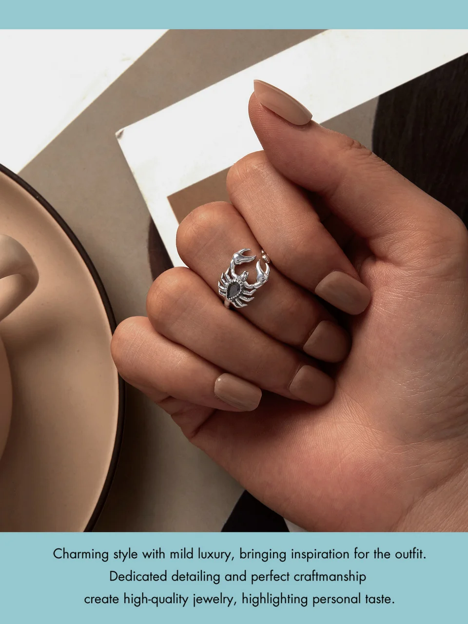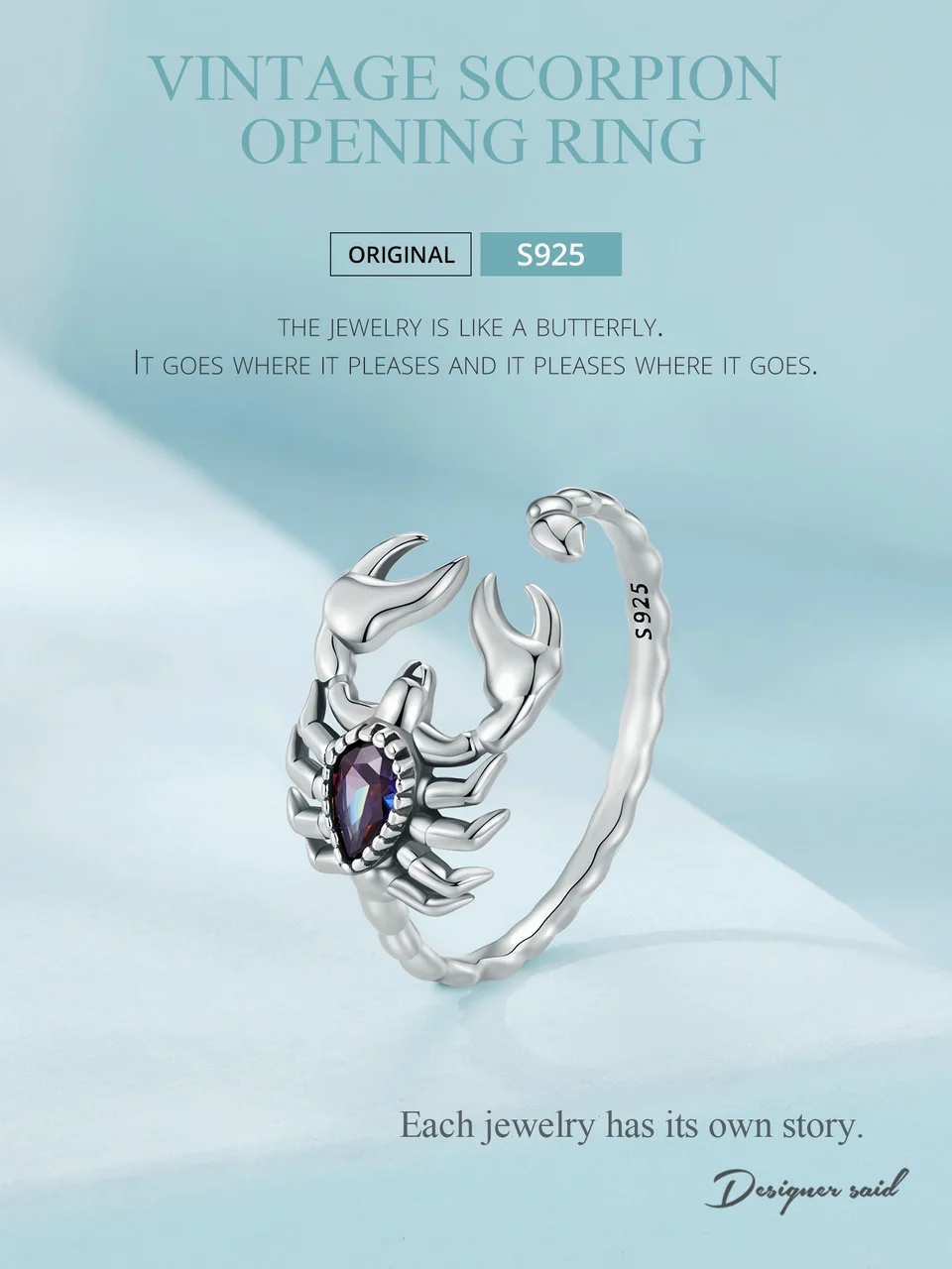 O design retrô do anel Escorpião é inspirado na simbologia do escorpião, um animal poderoso que representa transformação, força e proteção. Com um acabamento primoroso em prata de alta qualidade, a joia apresenta um cristal cuidadosamente lapidado que confere um brilho singular, adicionando um toque místico e enigmático ao visual.