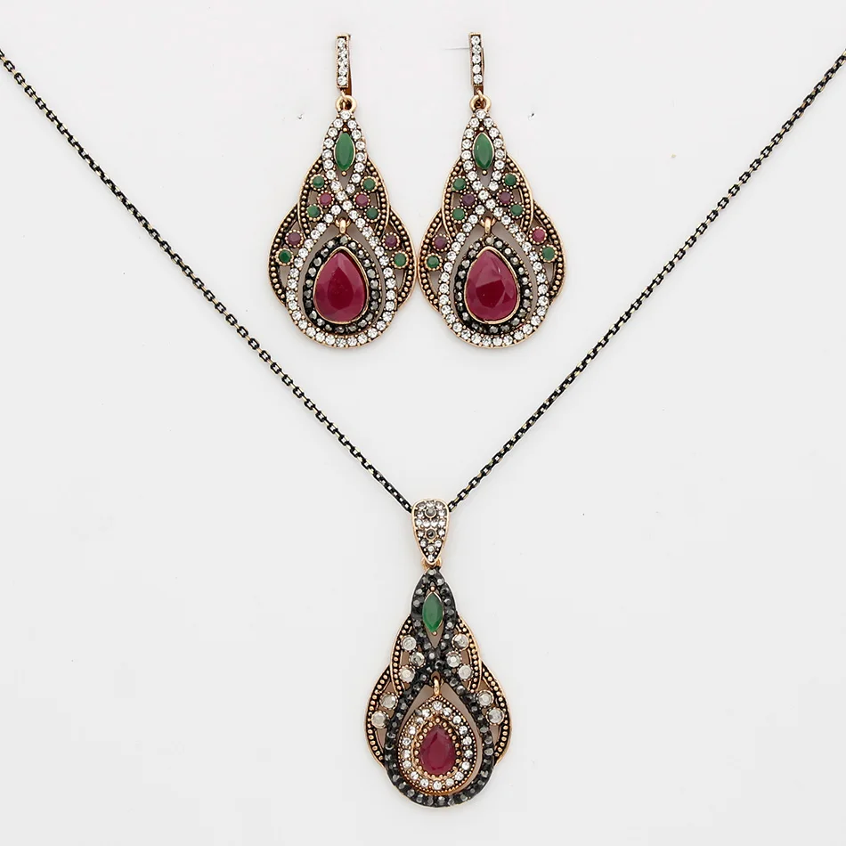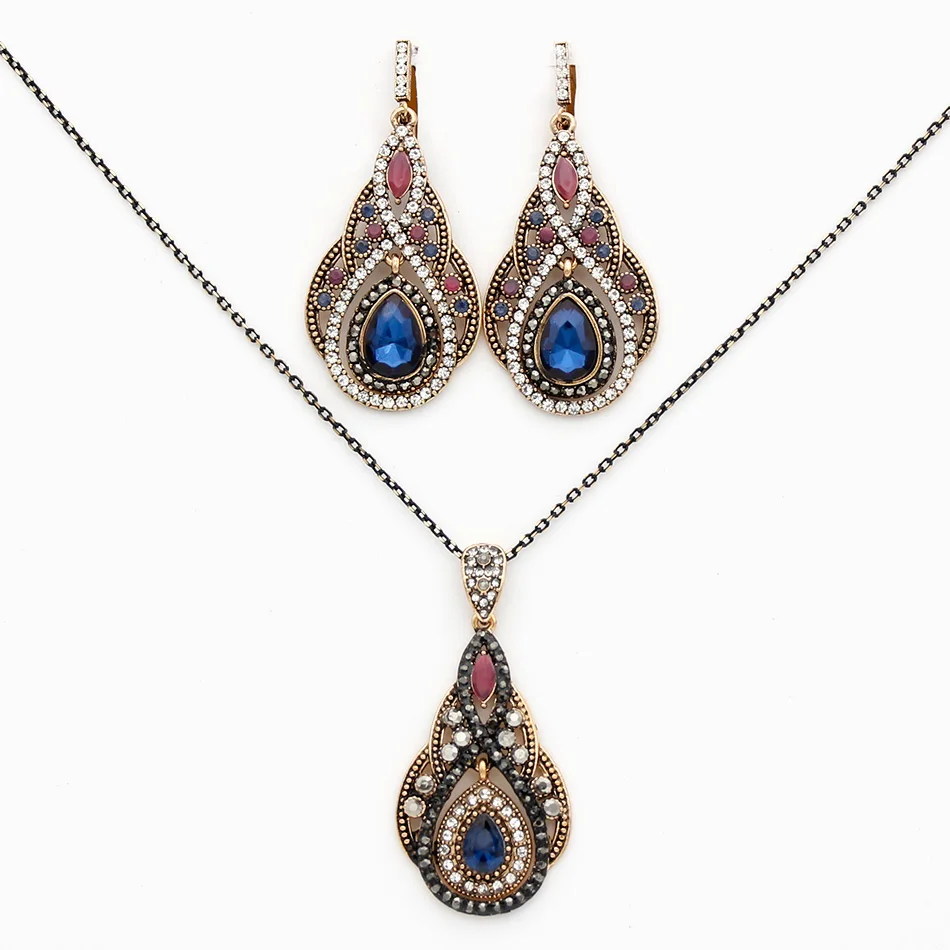Este conjunto exclusivo apresenta um design delicado e harmonioso, inspirado na arte oriental turca, conhecido por seus detalhes minuciosos e simbolismos que remetem a proteção, sorte e prosperidade. Os brincos longos, que alongam o rosto com graça, combinam perfeitamente com o colar pingente, criando um visual que é ao mesmo tempo moderno e tradicional.