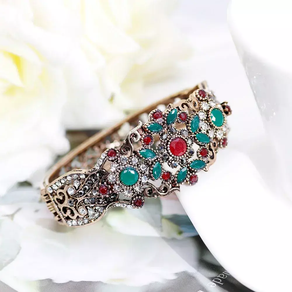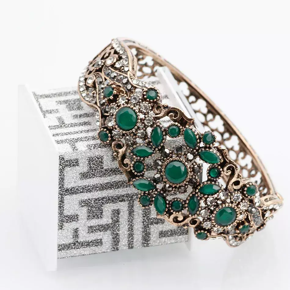 Apresentamos a Pulseira Manguito Turca Luxuosa – Joia Árabe Dourada com Strass e Flor, Estilo Antigo, uma peça única que combina tradição, elegância e sofisticação. Esta pulseira é perfeita para quem valoriza o requinte das joias artesanais com um toque histórico e cultural que remete às belezas milenares do Oriente Médio. Seu design destaca a beleza do estilo árabe antigo, com uma estrutura bem trabalhada, adornada com strass que reflete a luz de forma deslumbrante, realçando seu pulso em qualquer ocasião.