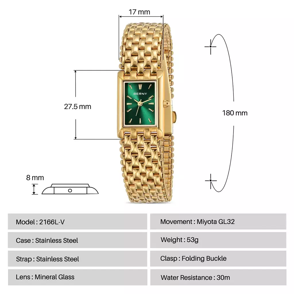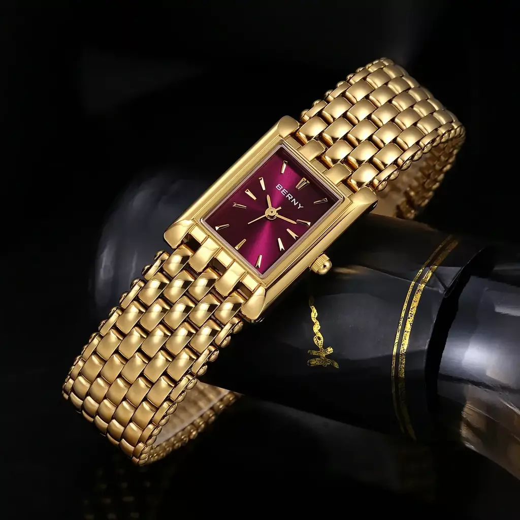 Apresentando um mostrador quadrado vermelho bordô e um elegante fecho de pulseira, é uma adição elegante a qualquer roupa.