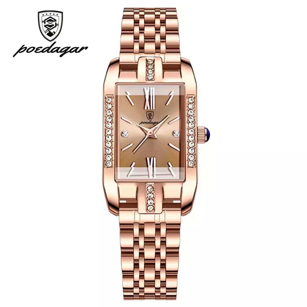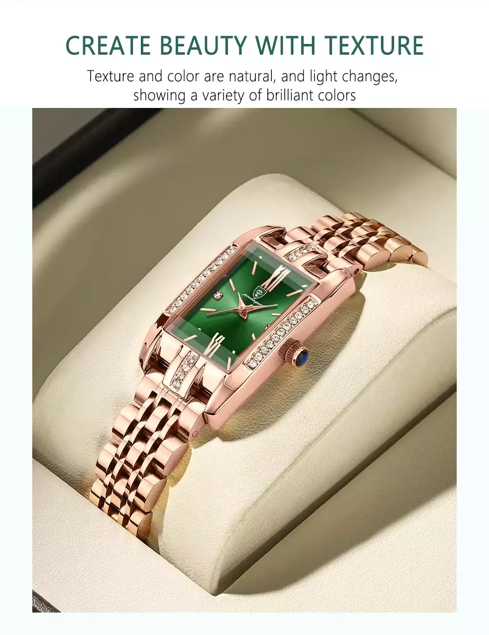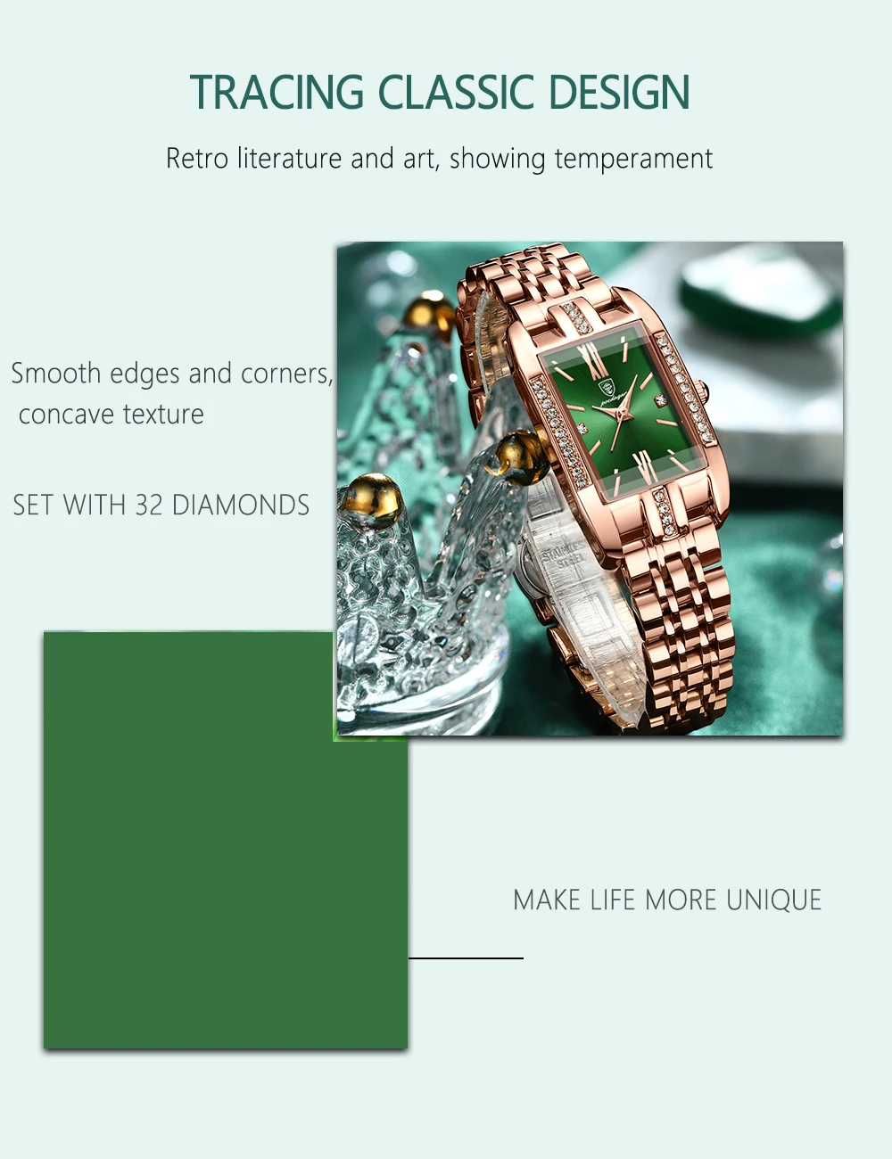 Seu design quadrado moderno e único se destaca à primeira vista, proporcionando um visual contemporâneo e sofisticado que acompanha perfeitamente qualquer estilo, seja casual, social ou formal. O aço inoxidável é resistente à corrosão e ao desgaste, garantindo a durabilidade do relógio mesmo para quem tem uma rotina agitada. Além disso, os detalhes em cristais cuidadosamente aplicados ao redor da caixa adicionam um brilho sutil e atraente, elevando o conceito de luxo sem perder a delicadeza.